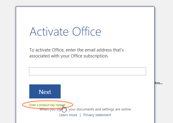 安裝完成後,第一次打開 Office ,會要求你輸入專業版的郵件帳號,這時候不要理他,選擇左下方小小的「 Enter a product key 」連結。