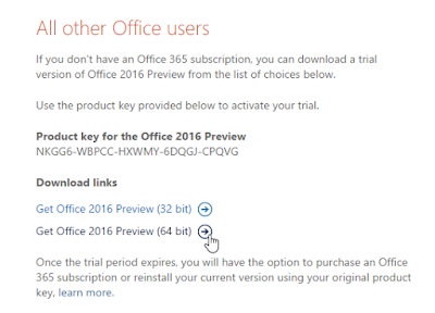進入「 Office 2016 預覽版下載網頁」,往下捲動網頁找到下載 32 位元與 64 位元版本的下載點,點擊後就可以下載安裝程式。