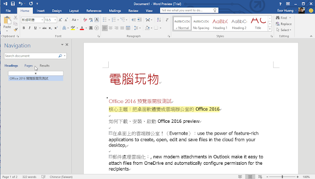 「 Office 2016 Windows 預覽版」整體介面看起來和之前的版本沒有太大的不同,但是核心的工作流程已經改變,從傳統的單機文書工作軟體,更進一步地預設成為一個桌面雲端辦公室。