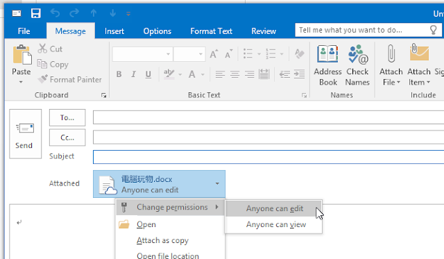 新版 Outlook 軟體中要插入郵件附加檔案時,預設是選擇 OneDrive 中的雲端檔案,插入雲端檔案的連結,並且自動開放這個雲端檔案的使用權限給郵寄對象。