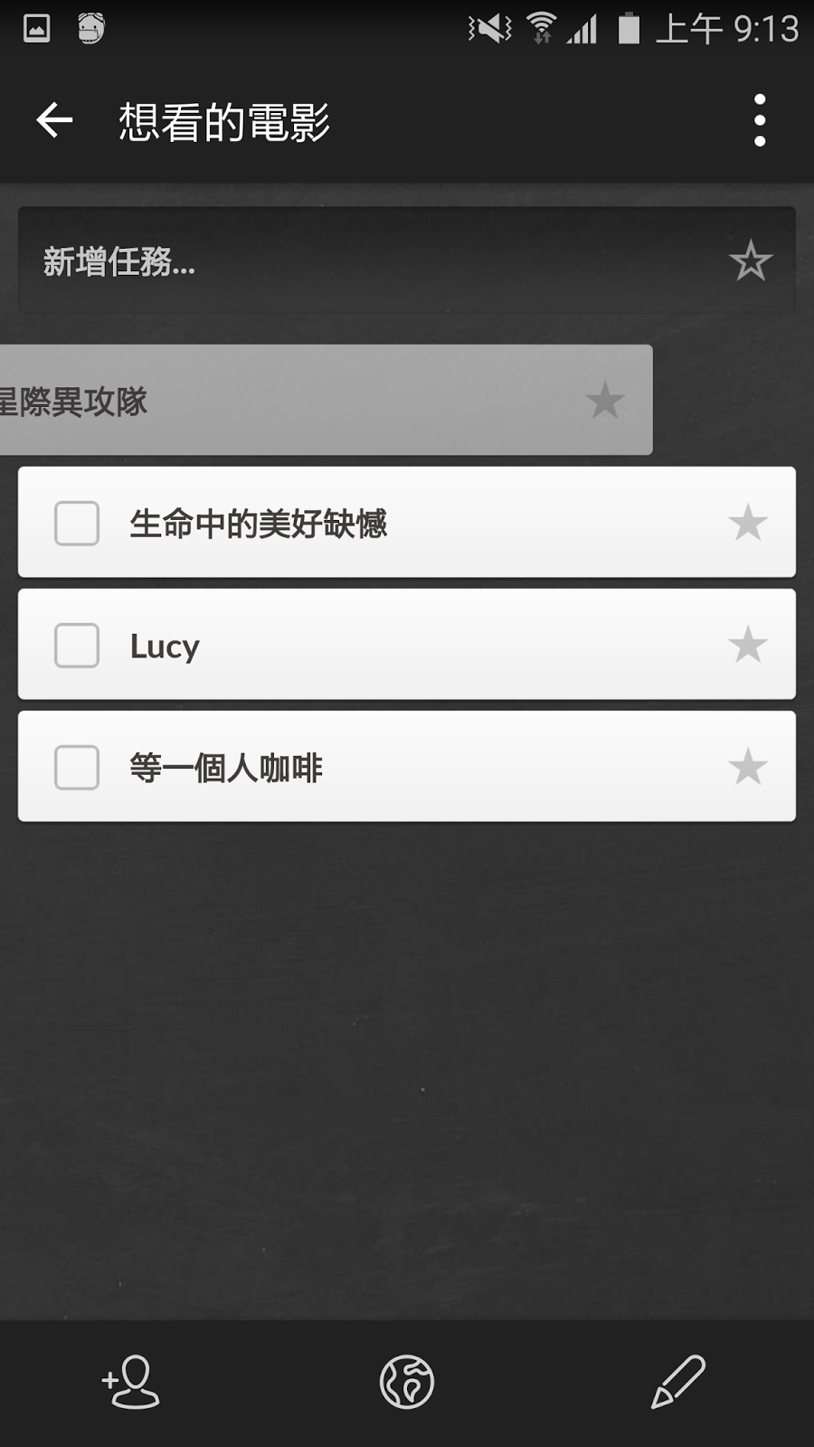 Wunderlist 的 Android 版本讓新增任務變成一個非常直覺簡便的快速按鈕,在清單中也可以透過滑動快速進行切換或移除,讓單手就能完成高效率的待辦清單管理。