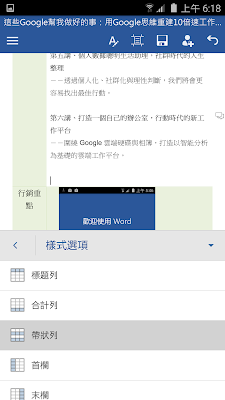 除了基本的文字內容編輯修改外,微軟 Office App 另外一大特色就是支援許多電腦版 Office 裡大家常用的重點編輯功能。