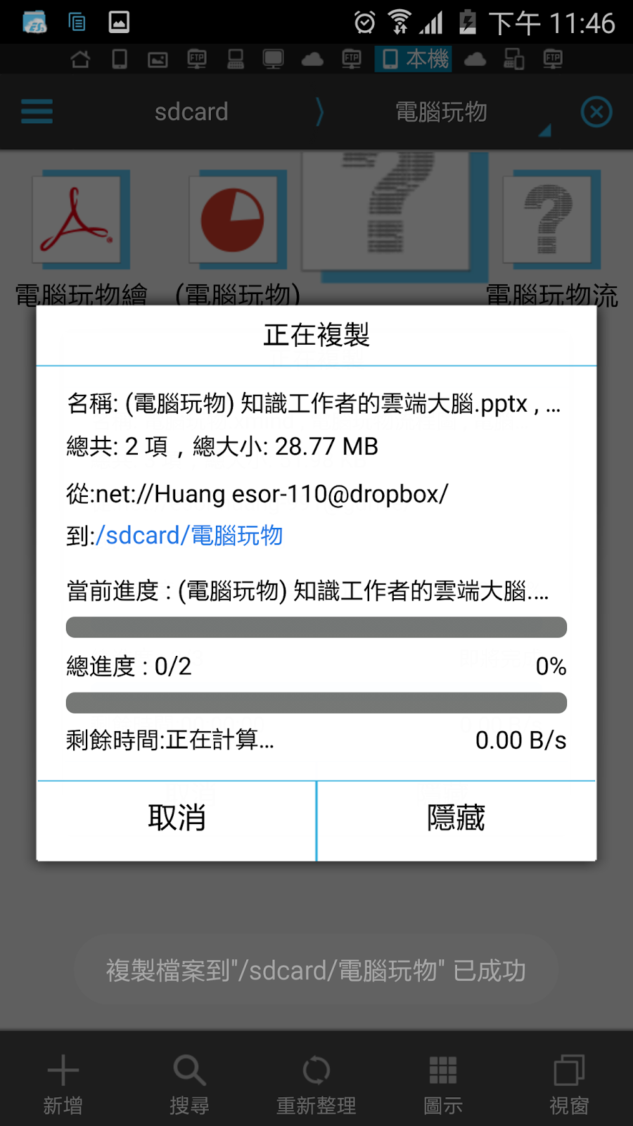也就是我可以在 Google 雲端硬碟上分批複製多個檔案資料,然後在「 ES 檔案瀏覽器」上打開 FTP 裡的某個資料夾,透過多重剪貼簿直接一次全部貼上,接著「 ES 檔案瀏覽器」就會自動幫我完成從雲端硬碟下載檔案並上傳到 FTP 的動作,實在非常方便。