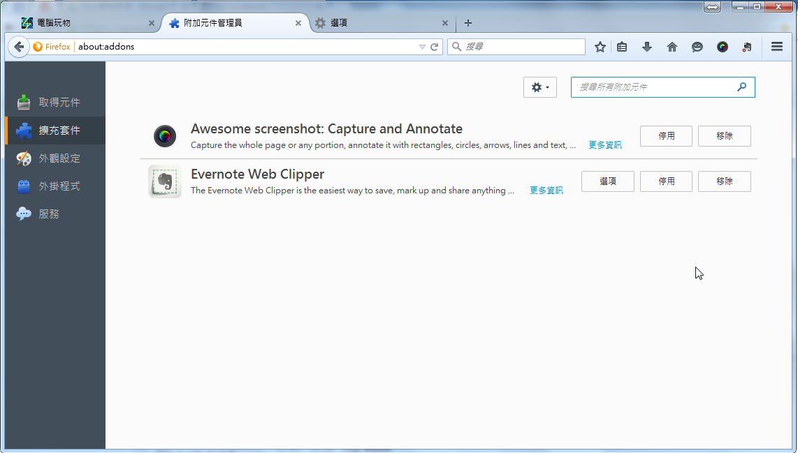 另外一個在這次 Firefox 40 中的重要更新,就是在[擴充套件]的管理頁面中用更美觀、清晰的清單讓我們快速管理套件,並且針對沒有獲得 Mozilla 簽名認證的套件還會出現提醒,讓我們確認可疑的套件。