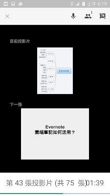 我只要在手機上就能透過「 Google 簡報 Android App 」切換簡報,還能預覽簡報備忘錄,並且透過麥克風傳遞聲音,一場遠端針對多人進行的行動會議報告就可以完成了。