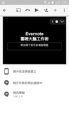 例如今天我收到的更新,把我常常使用的「 Google 簡報 App 」與「 Google Hangouts 視訊 App 」在 Android 版做了功能上的整合,現在我可以在使用手機或平板的情況下,從 Google 簡報 App 開啟結合簡報與語音的線上視訊直播,邀請大家遠端參與一場行動會議、行動課程的即時簡報。
