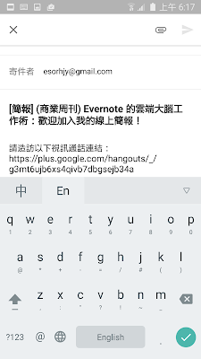 從「 Google 簡報 Android App 」開啟一場簡報直播後,會出現[傳送邀請]與[播放簡報]兩個按鈕,在傳送邀請中可以獲得這場直播的網址,把專屬網址傳送給同事或學員即可。